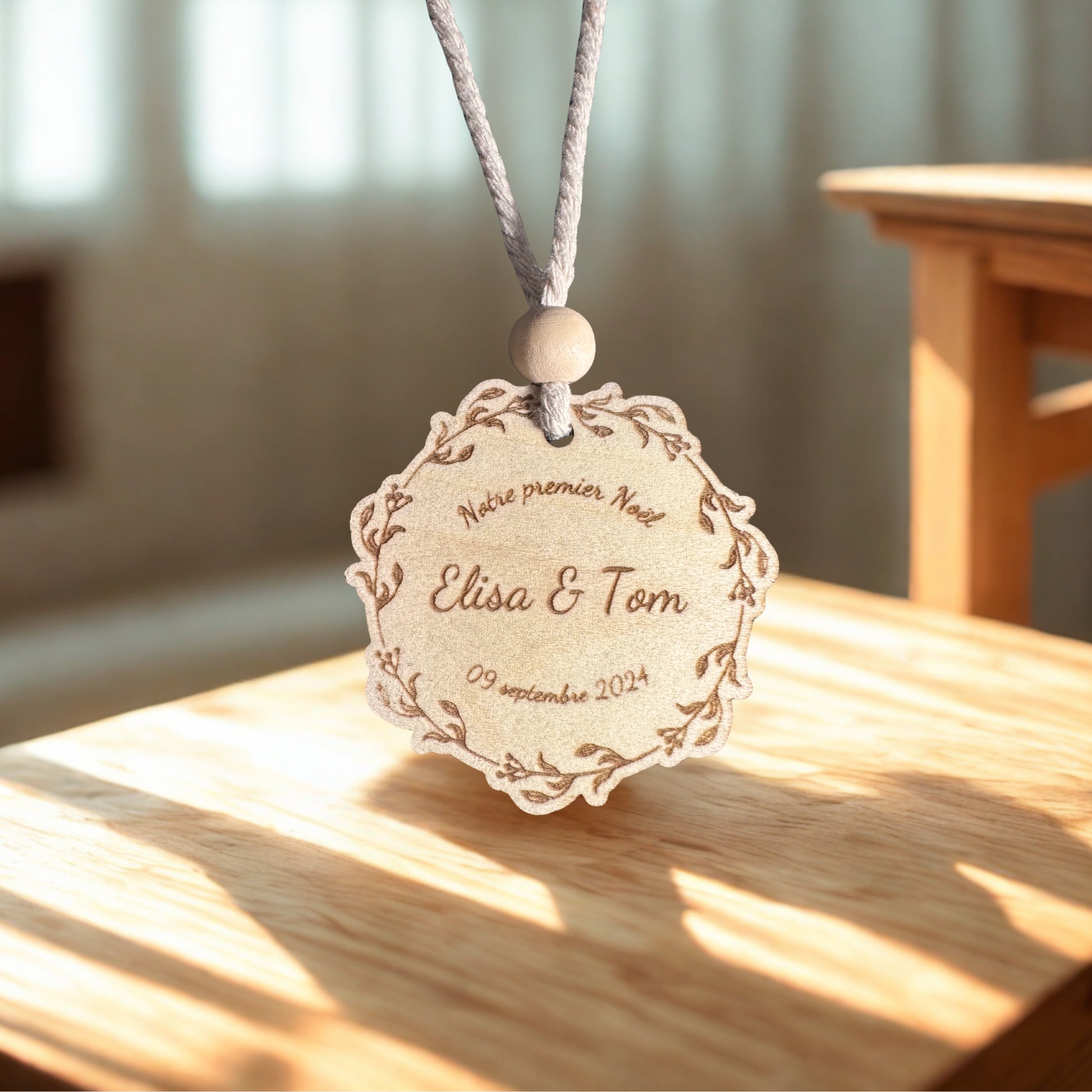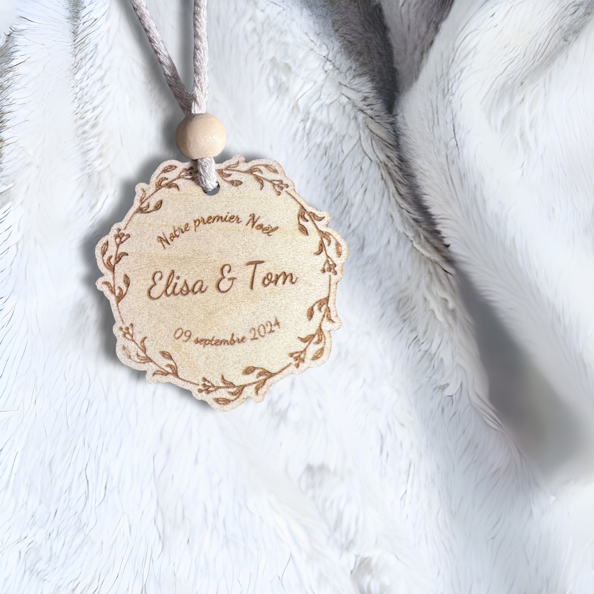 Boule de Noël en bois naturel avec gravure personnalisée.