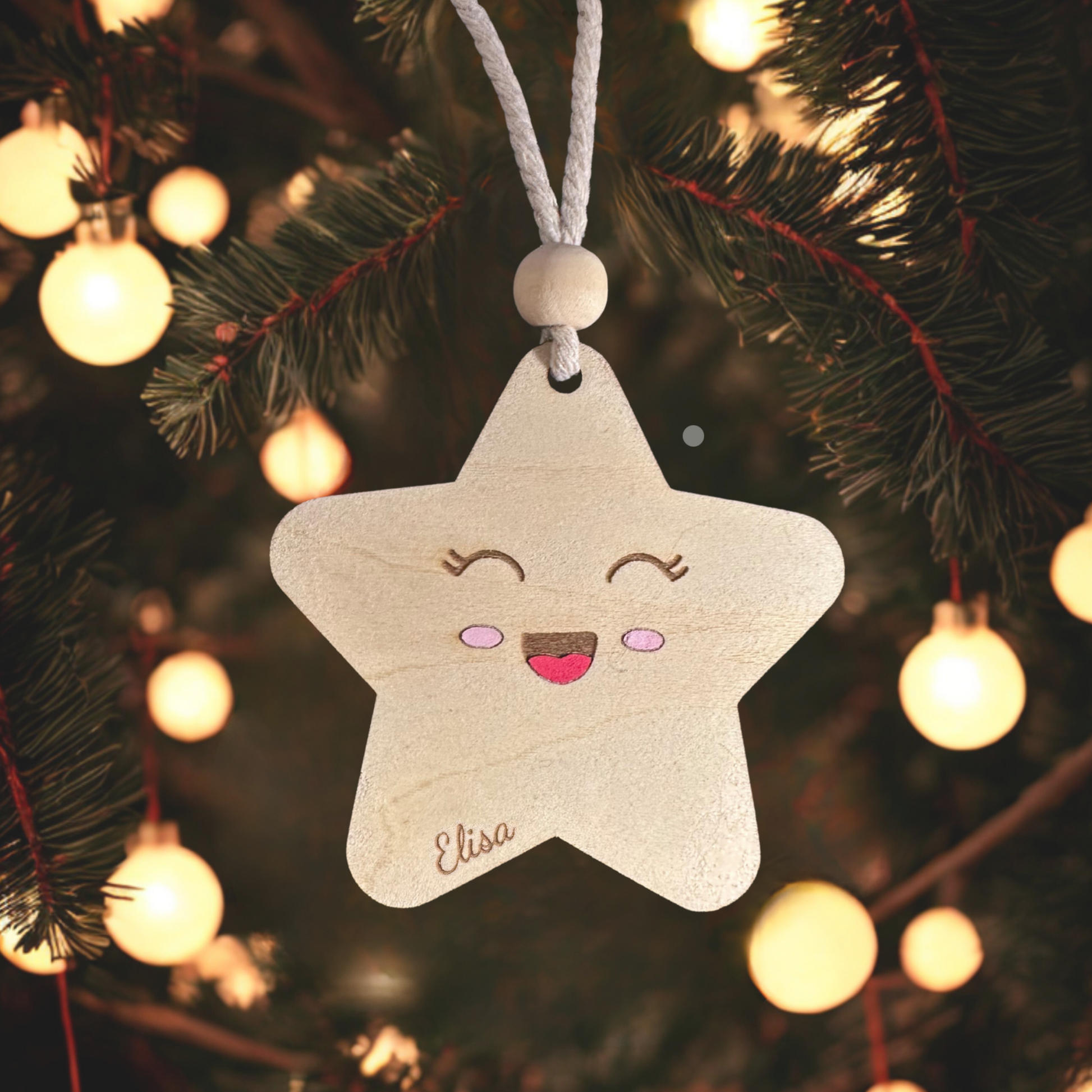Boule de Noël en bois naturel avec gravure personnalisée.