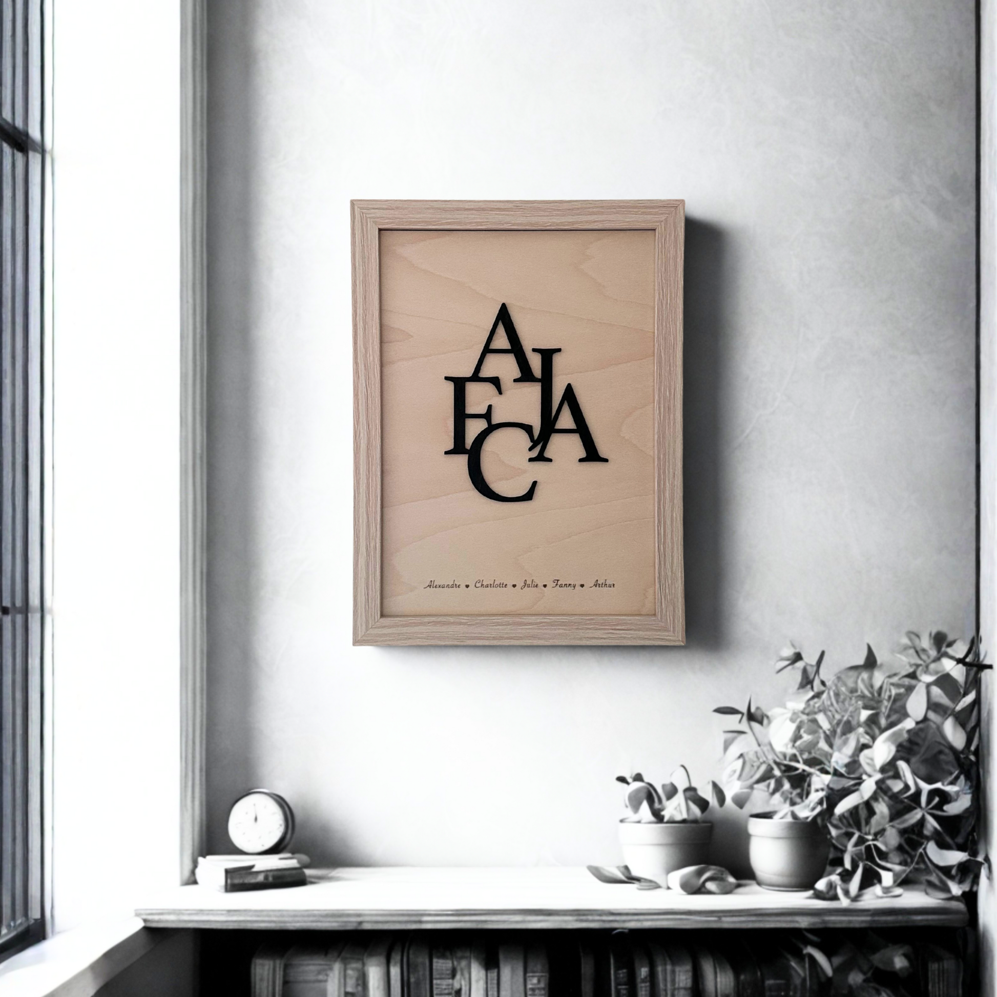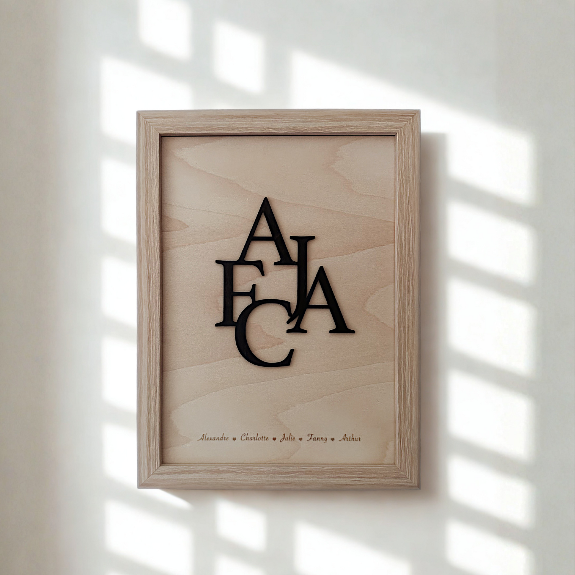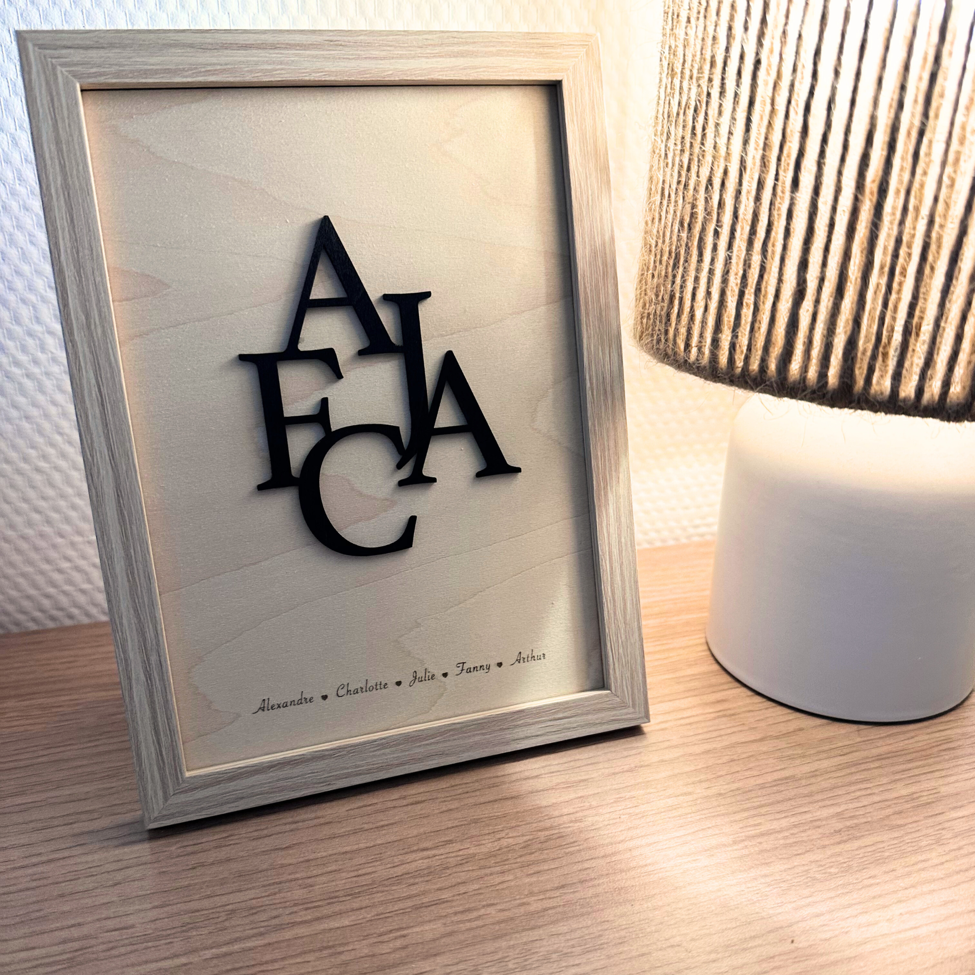 Cadre en bois naturel avec lettres en relief noires, représentant les initiales de votre famille.