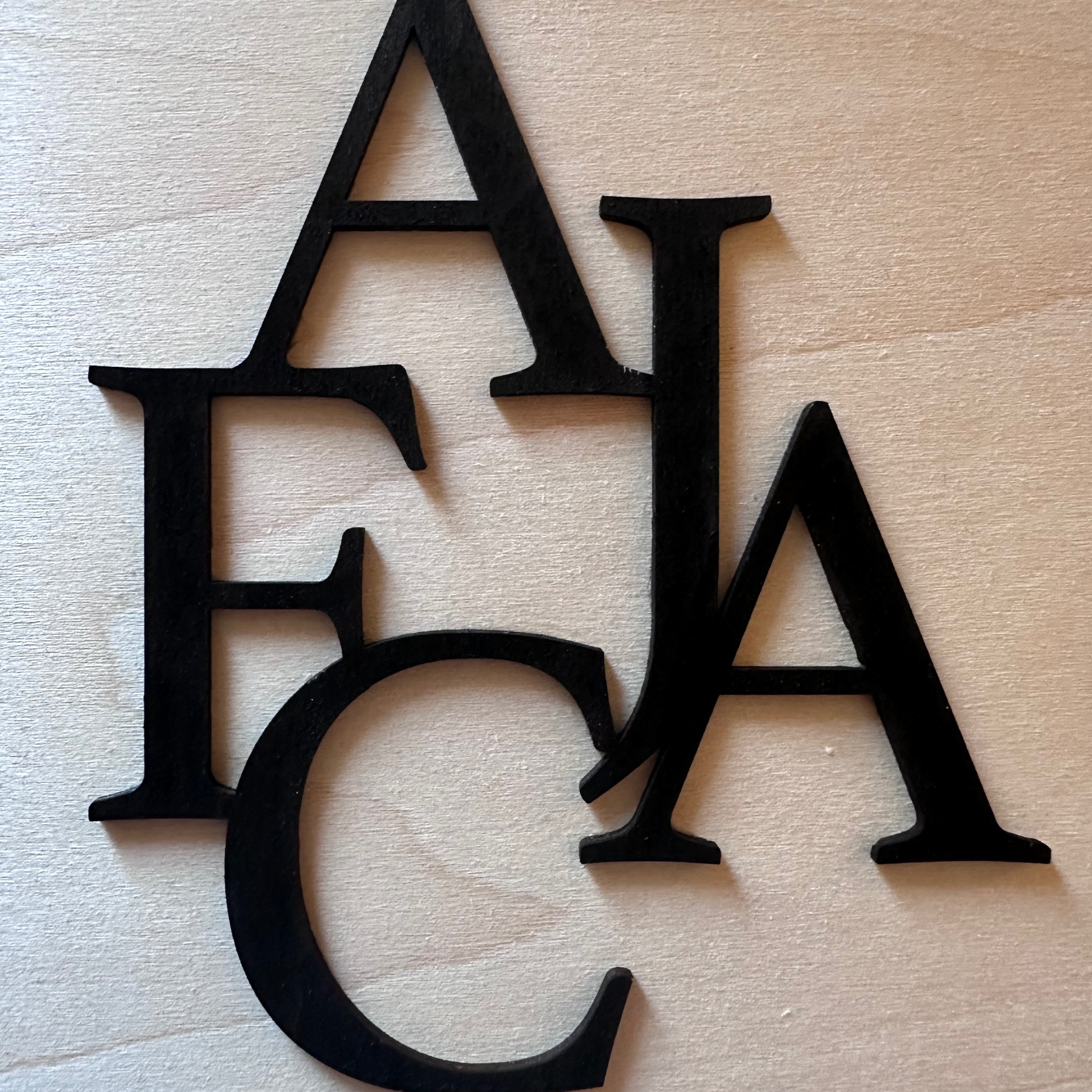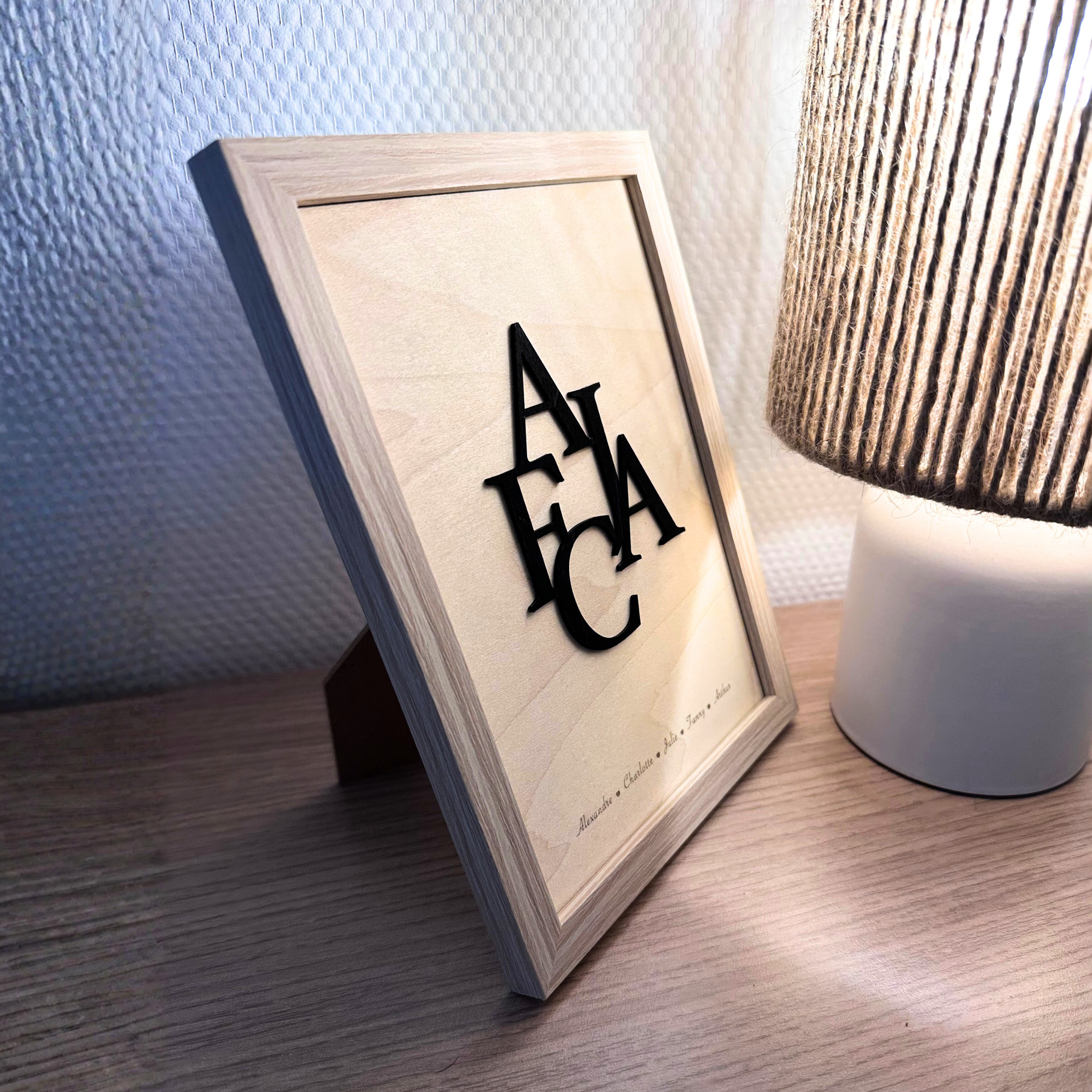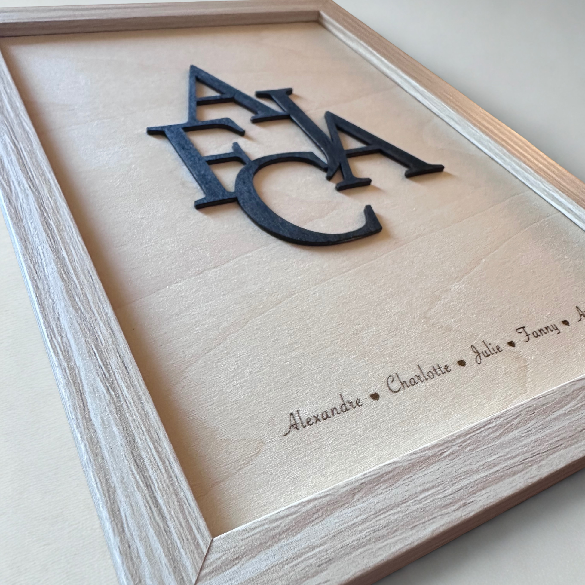 Cadre en bois naturel avec lettres en relief noires, représentant les initiales de votre famille.